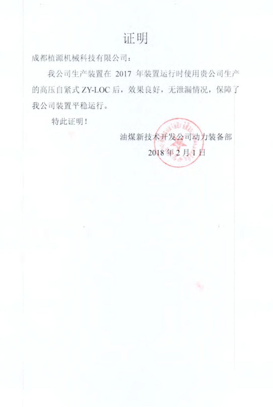 油煤新技術(shù)開發(fā)公司使用證明