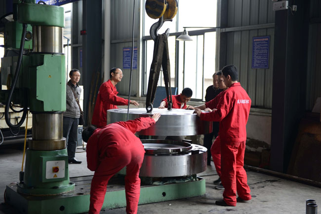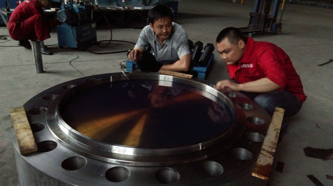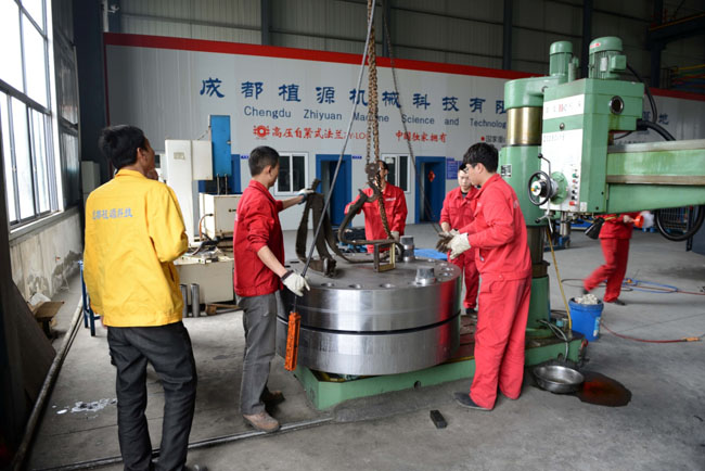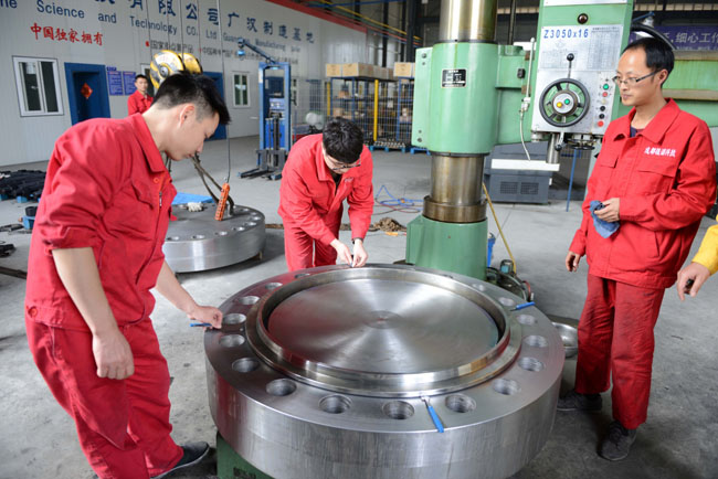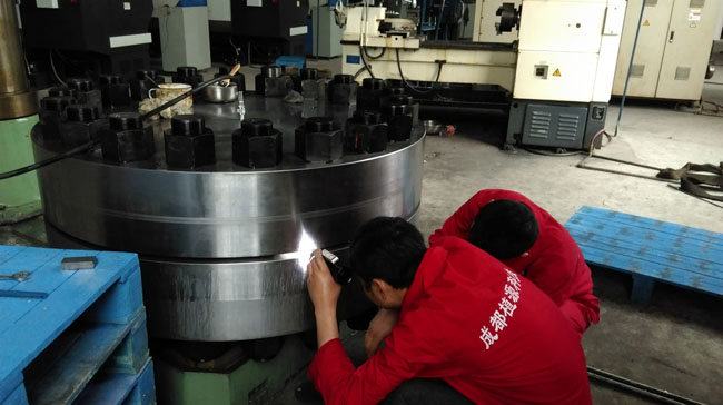 在神華多部門專家組離開后,“成都植源”便成立了專門的大口徑法蘭技術(shù)攻關(guān)團(tuán)隊(duì),由公司總工程師侯亮平負(fù)責(zé),對(duì)課題問題展開了系統(tǒng)工作:針對(duì)煤制油項(xiàng)目加氫反應(yīng)器的DN900自緊式法蘭,提出研究方案,進(jìn)行技術(shù)論證,從人員組織、主攻方向明確、設(shè)計(jì)校審明確,到責(zé)任落實(shí)、材料落實(shí)、機(jī)具落實(shí)、工裝落實(shí),確保理論和模擬實(shí)驗(yàn)實(shí)施的切實(shí)可行;又投入近百萬的科研經(jīng)費(fèi),對(duì)上述工作加以保障。